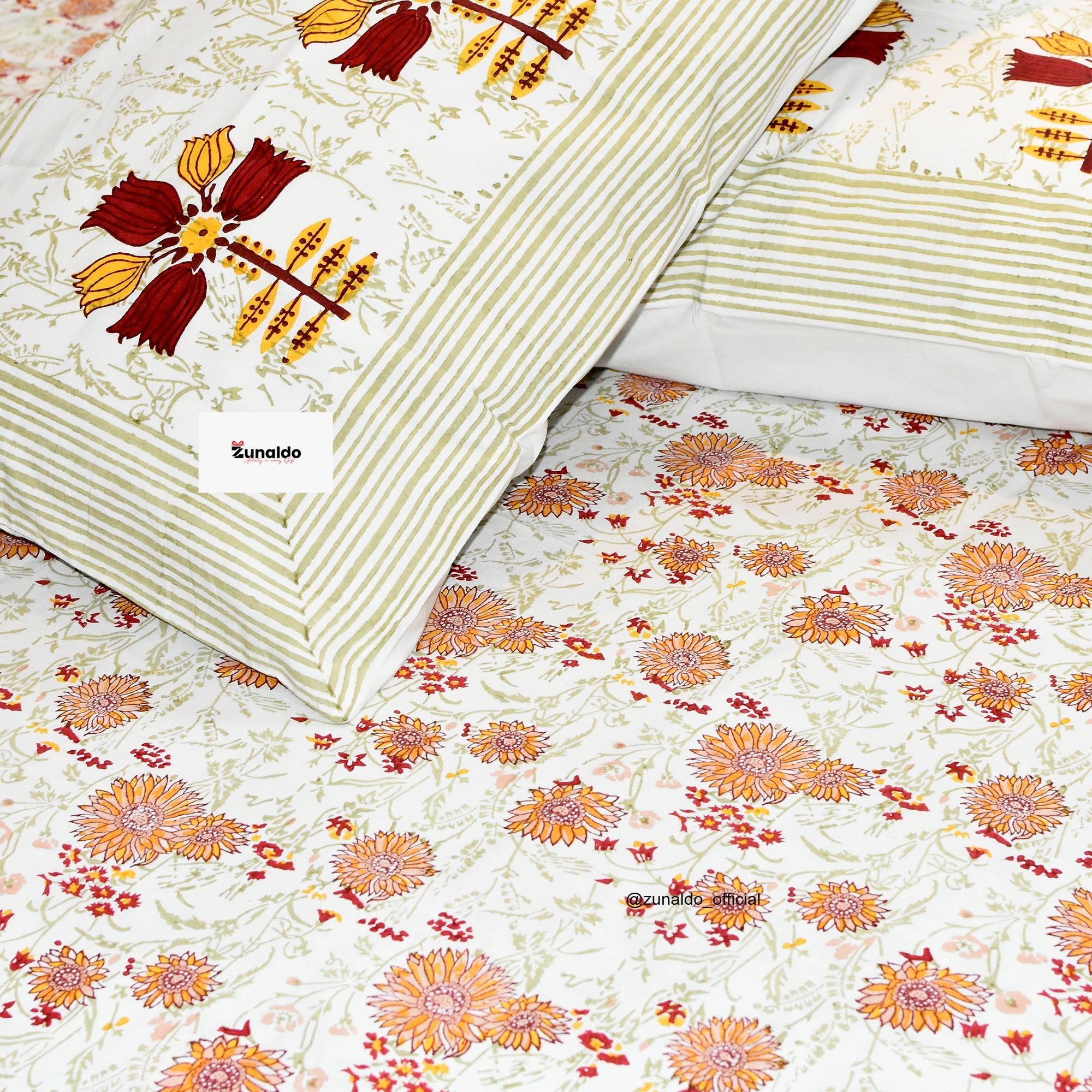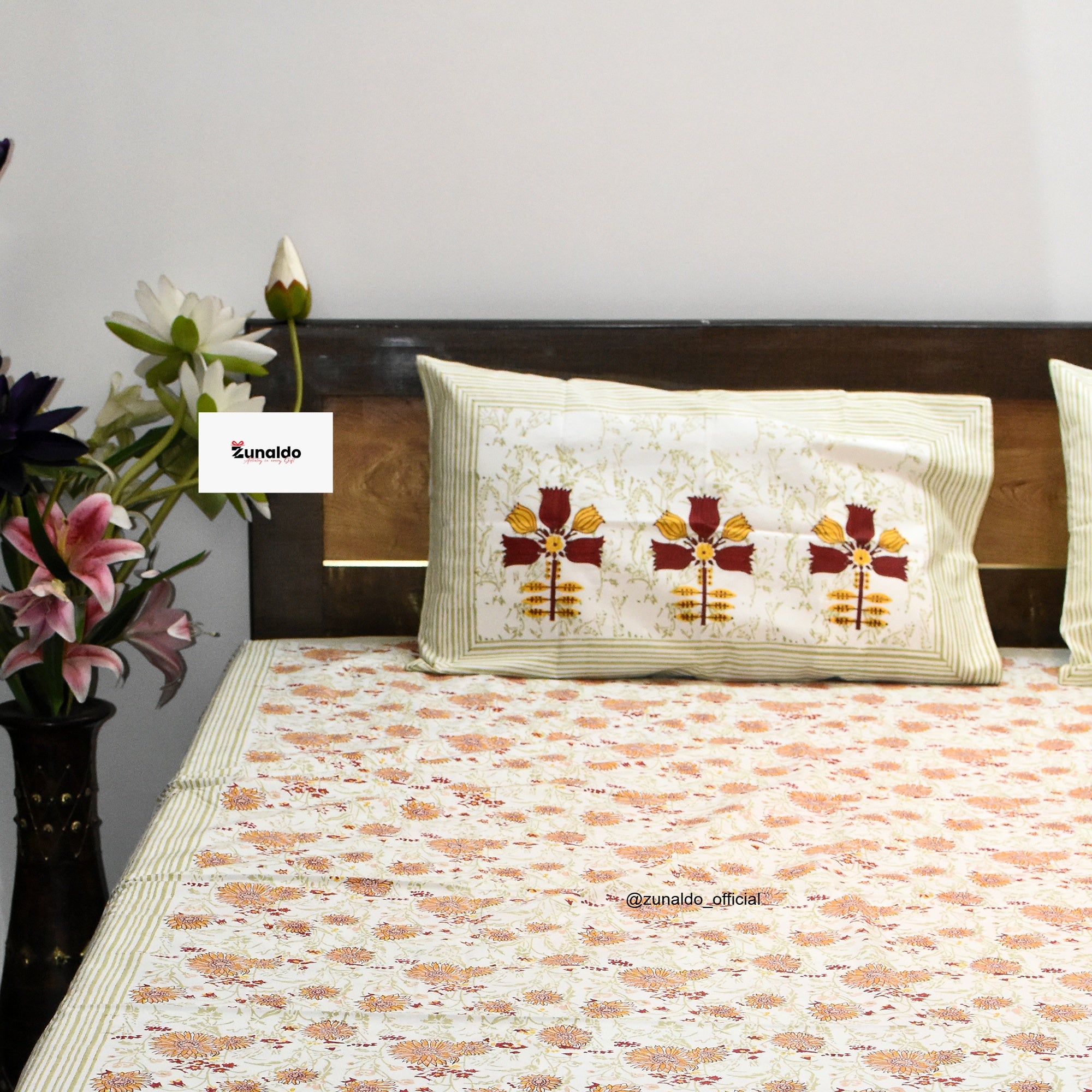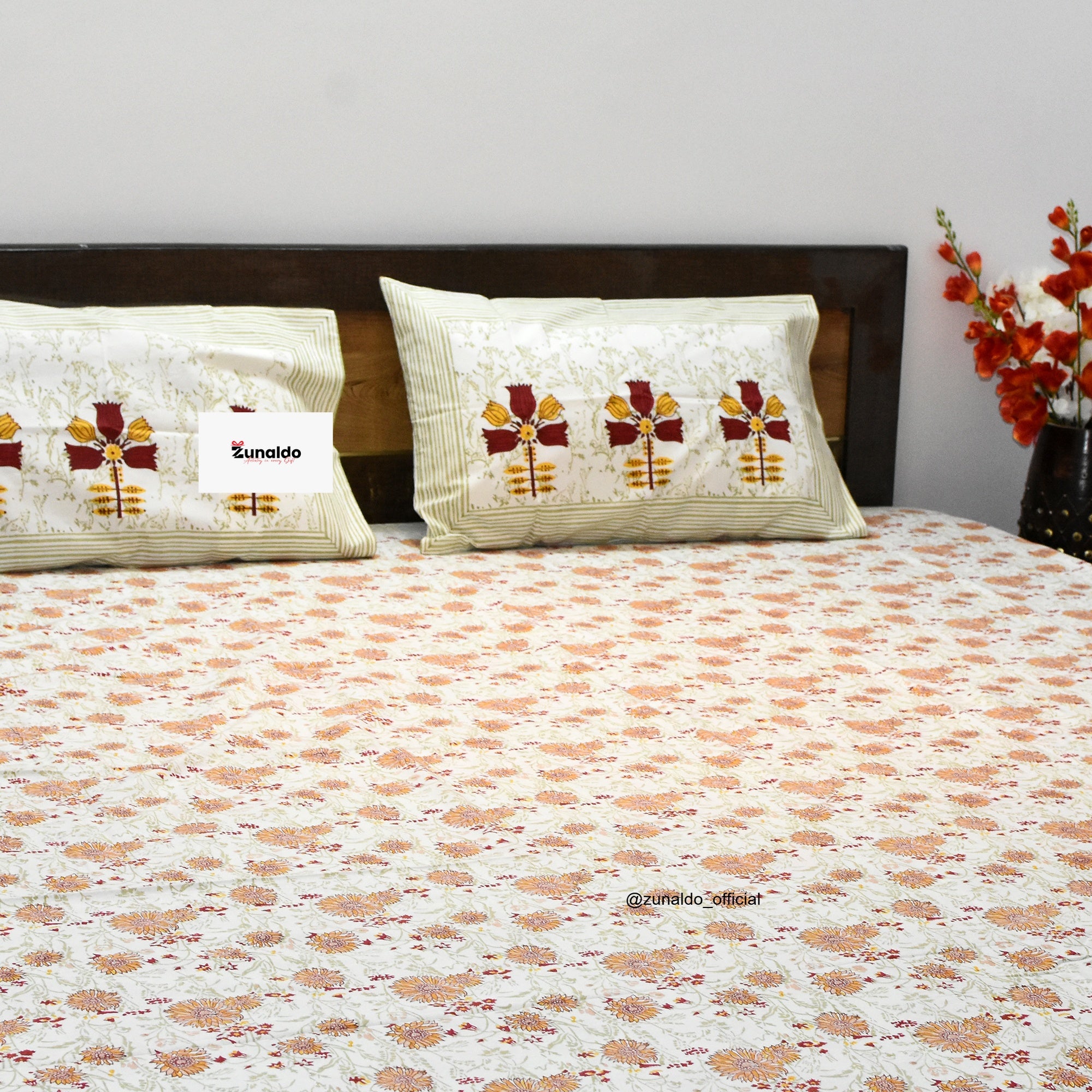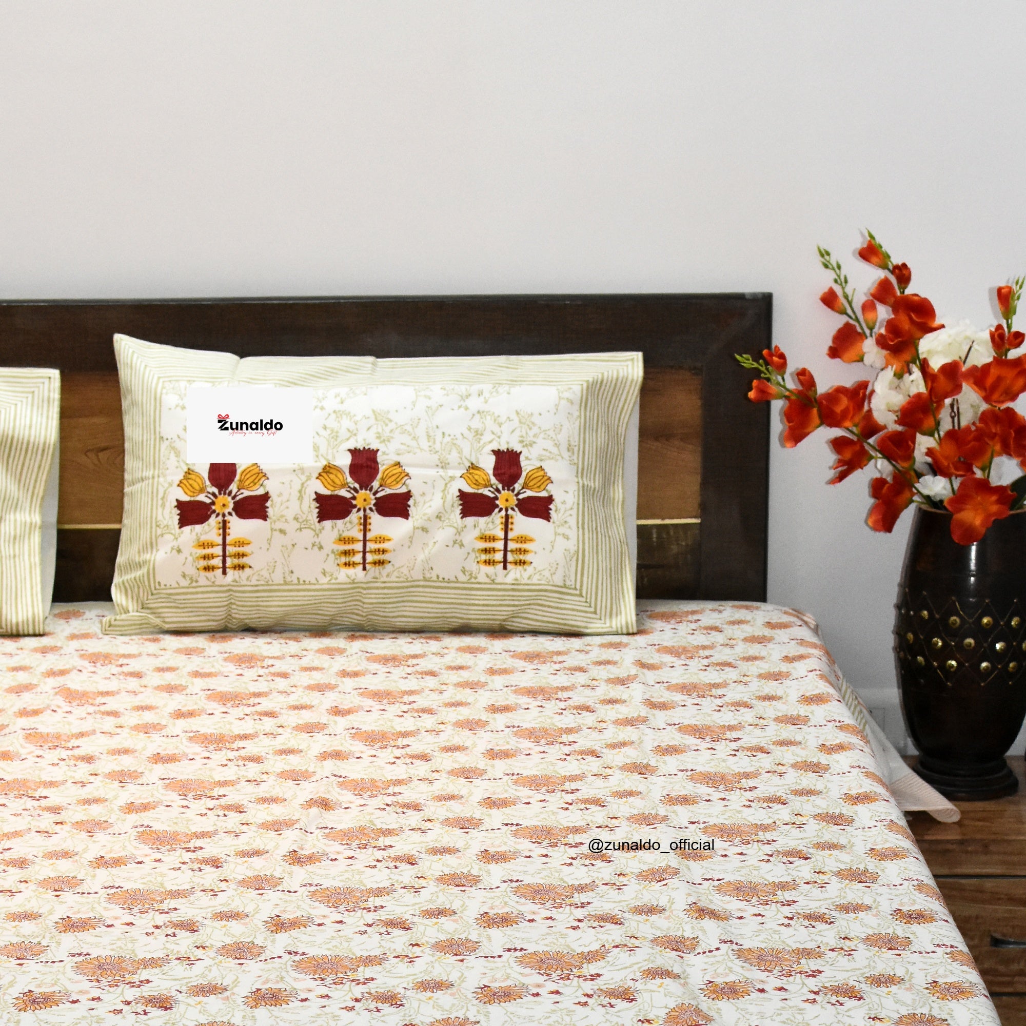 Add a pop of elegance to your bedroom with this Pure Cotton King Size Bedsheet featuring warm orange hand block floral motifs. The set is beautifully paired with unique maroon and mustard floral design pillow covers bordered with olive stripes – perfect for giving your room a vibrant ethnic touch.